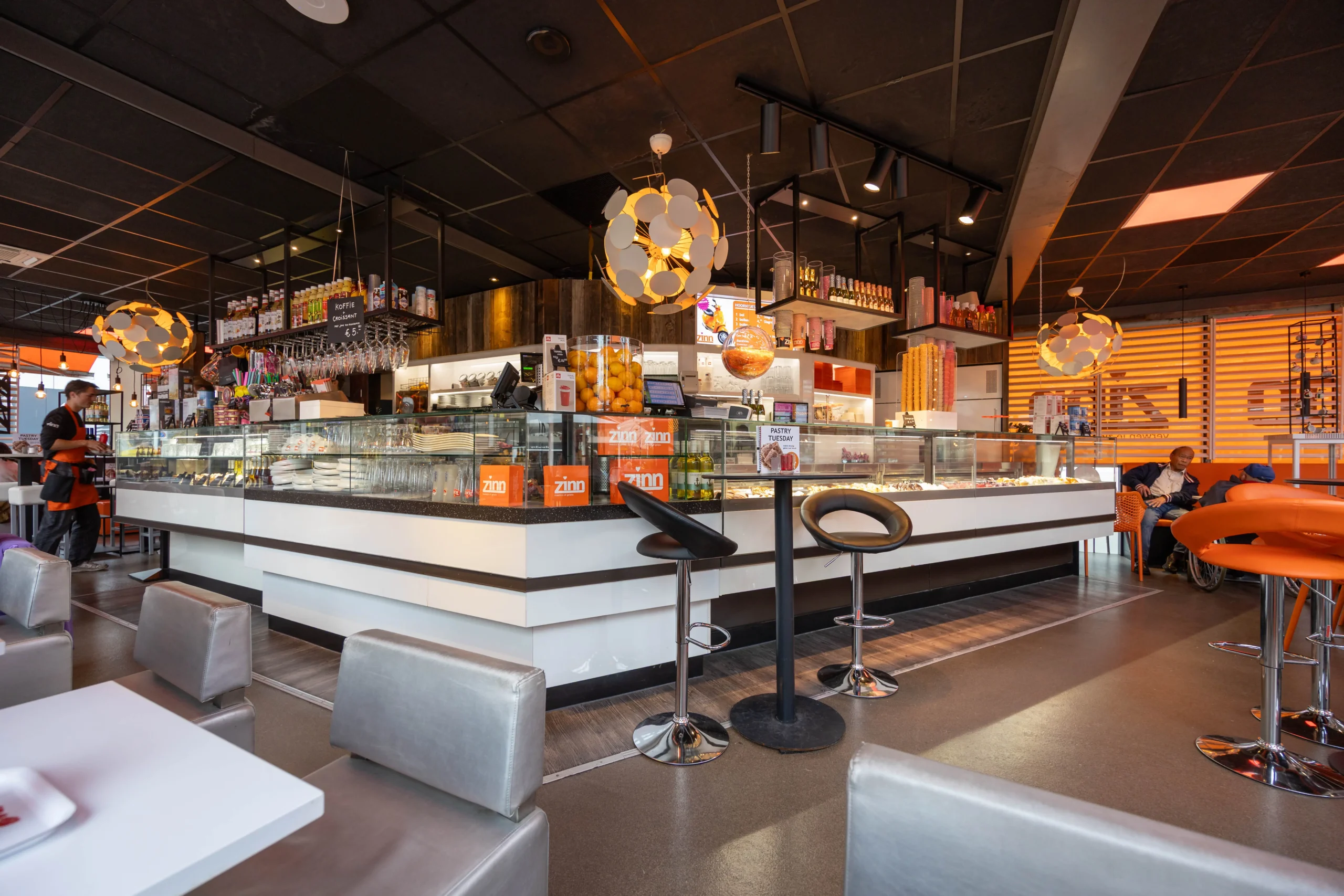 Voor deze ijssalon creëerden wij een warme, uitnodigende sfeer waarin gasten graag even blijven zitten. Het ontwerp combineert frisse oranje accenten met strakke witte en donkere elementen, waardoor het geheel eigentijds en herkenbaar oogt.